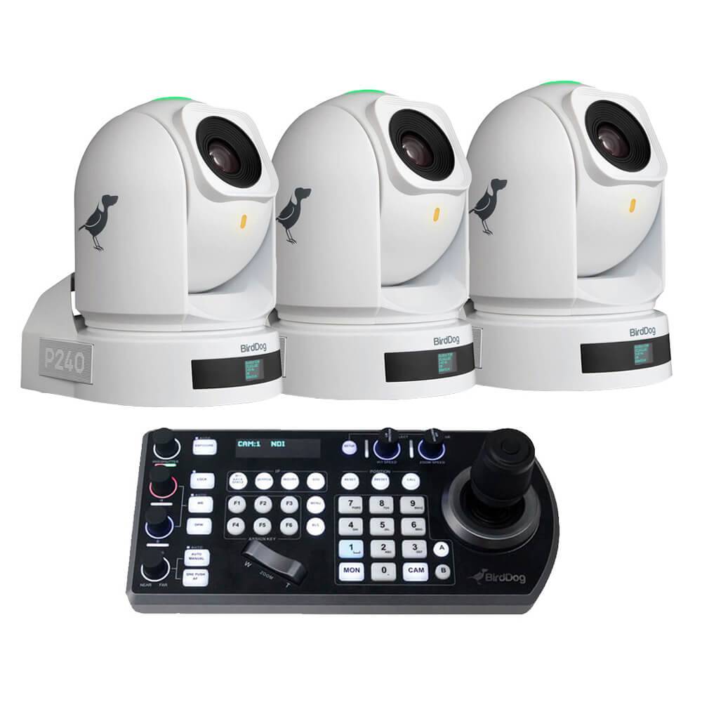 The BirdDog P240 40X Full NDI PTZ 3-Camera Bundle (White) includes 3x P240 Full NDI PTZ Camera with HDMI/3G-SDI outputs and BirdDog PTZ Keyboard. The P240 offers three output options, including NDI, SDI, and HDMI, for maximum video flexibility, while Balanced XLR audio connections add professional audio connections. The IP output options include multiple NDI® flavors, such as Full NDI, NDI|HX2, and HX3, SRT, and h.264, while BirdDog Cloud 3.0 integration enables globally connected remote productions.