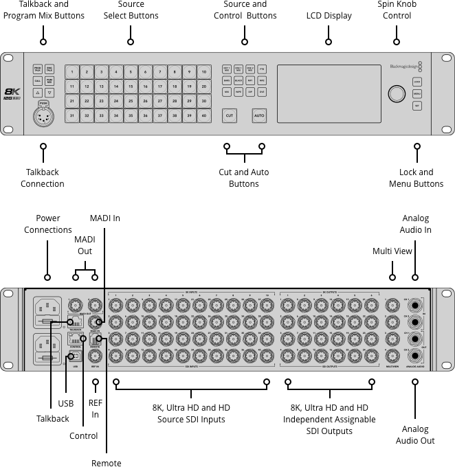 For control, the switcher includes a front panel with LCD display, 42 backlit buttons, and full menu navigation. You can switch sources, control transitions, adjust settings, and trigger macros directly from the front. It also includes RJ45 talkback ports, RS-422 remote, and full software control over Ethernet or USB.