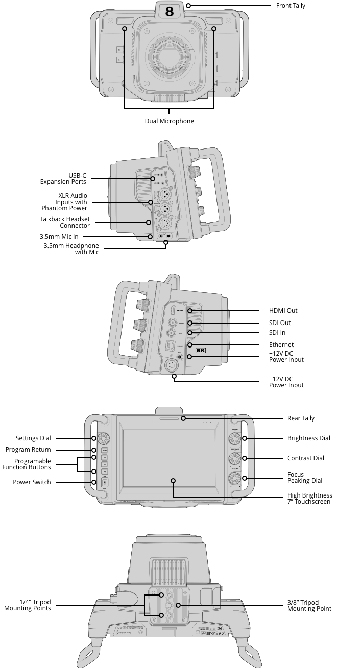 Blackmagic Studio Cameras feature physical buttons and knobs as well as controls on the touchscreen. Knobs on the right side of the camera allow adjusting of the brightness, contrast and focus peaking. The focus peaking knob is incredibly useful as it lets you fine tune the detail highlight so you can get perfect focus as you zoom. The 3 function buttons on the left can have functions assigned to them, such as zebra, false color, focus peaking, LUTs and more! Plus you can change the function assigned to each button in the menus. The touchscreen also includes a heads up display with the most important shooting information, as well as menus for all camera settings, LUTs and custom presets.