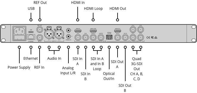The front panel includes a color LCD screen and tactile menu buttons. You can monitor format, frame rate, and conversion status right from the front—no need for a separate monitor. Fast setup and control make it a great fit for fast-paced events and field use.