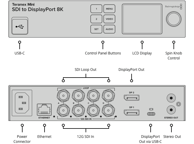 The innovative design is much better than regular converters as you can rack mount the converter if needed. The front panel feels elegant when placed on a desktop plus it includes buttons and a color display for video monitoring with audio meters and video standard. The rear panel has Quad Link 12G‑SDI for HD, Ultra HD as well as up to 8K formats. The Teranex Mini SDI to DisplayPort 8K HDR has a USB-C style connection for monitors such as the Apple Pro Display XDR, and 2 full size DisplayPort connections for regular computer monitors. The built-in scaler will ensure the video input standard is scaled to the native resolution of the connected DisplayPort monitor. Or, use the built-in pixel-by-pixel mode to view unscaled HD or 4K content. Plus, both models feature down conversion for using 8K sources on Ultra HD or HD televisions and monitors! You can even convert between 2SI and Square Division all automatically.