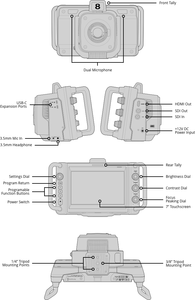 Large broadcasters use expensive studio cameras that are extremely large, so they’re not very portable. The distinctive Blackmagic Studio Camera has all the benefits of a large studio camera because it’s a combination of camera and viewfinder all in a single compact design. It features a lightweight carbon fiber reinforced polycarbonate body with innovative technology in a miniaturized design. The camera is designed for live production so it’s easy to track and frame shots with its large 7" viewfinder. The touchscreen has menus for camera settings, and there's knobs for brightness, contrast and focus peaking. Plus a tripod mount with mounting plate is included for fast setup!