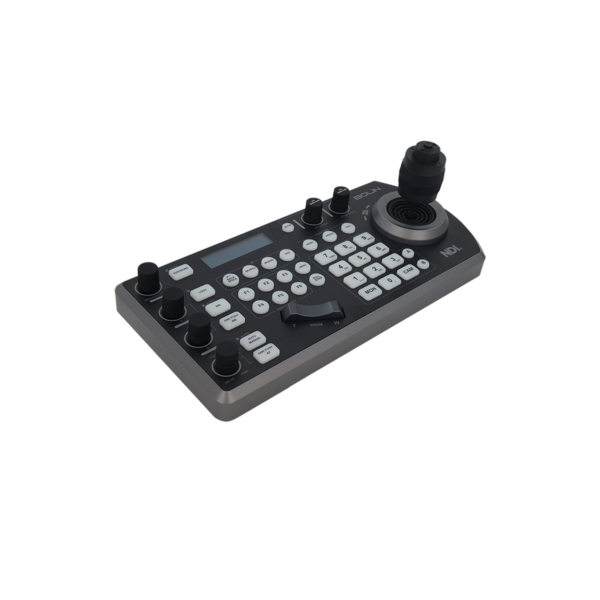 Newly upgraded KBD-1020N NDI PTZ Controller from Bolin is ergonomically designed to make critical PTZ camera functions easy to find and use. Details like dedicated knobs for PTZ variable speed control and for fine control over iris/shutter, red and blue adjustment, and focus, with auto/manual toggle. It has illuminated push buttons for camera selection and a three-axis joystick for smooth, precise camera movements.