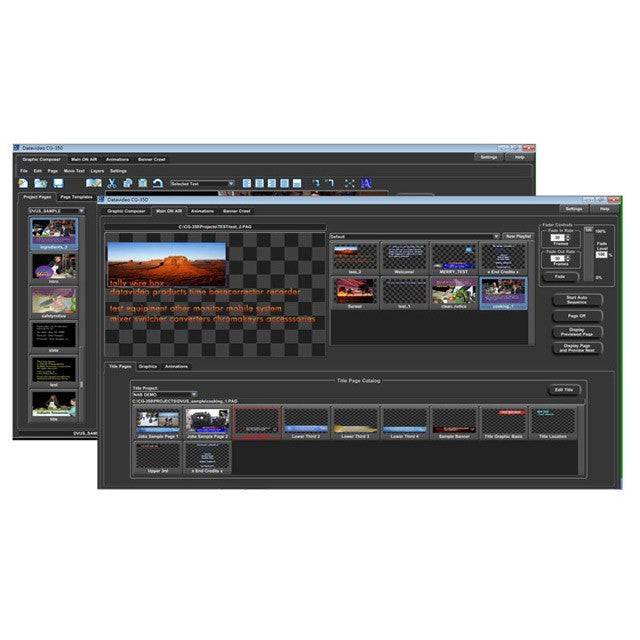DatavideoCG-300 is an HD/SD Character Generator Software extremely powerful titling program designed especially for the live broadcast and video post-production environment. The CG-300 comes with a Title Compose program for creating high-quality title pages. A display list can be created ahead of time to make on-air usage a simple, one keystroke operation, or you can randomly select the title pages while on air. Once the title pages have been composed, they can be displayed automatically or completely under Manual Control. It can be used to display standard format graphic. Title pages and graphic images can be freely intermixed with one another in any order.