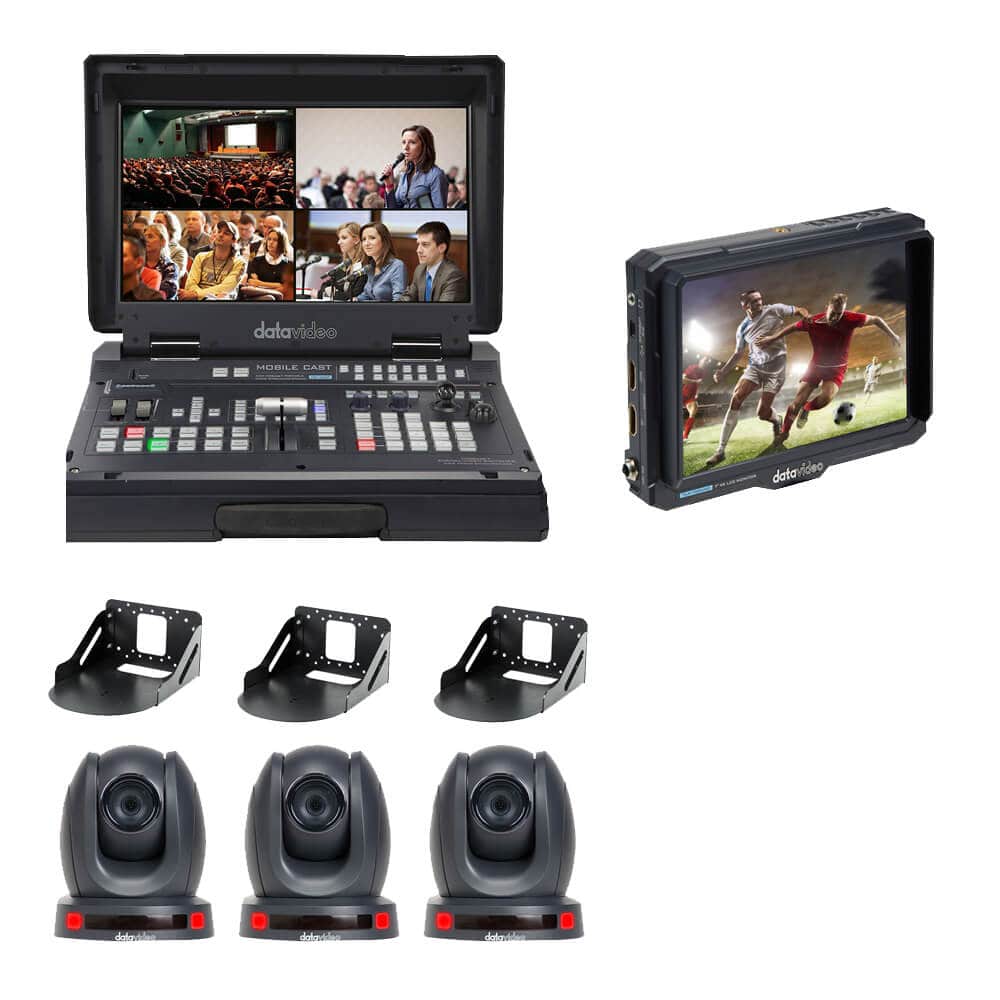 The Datavideo HS-1600T MK II Mobile Studio with 3x PTZ Cameras (Black) includes the Datavideo HS-1600T MK II 4-Channel HDBaseT Switcher, 3x PTC-140T HDBaseT PTZ cameras, 3x WM-1 wall mounts, one TLM-700UHD 7" HDMI monitor.