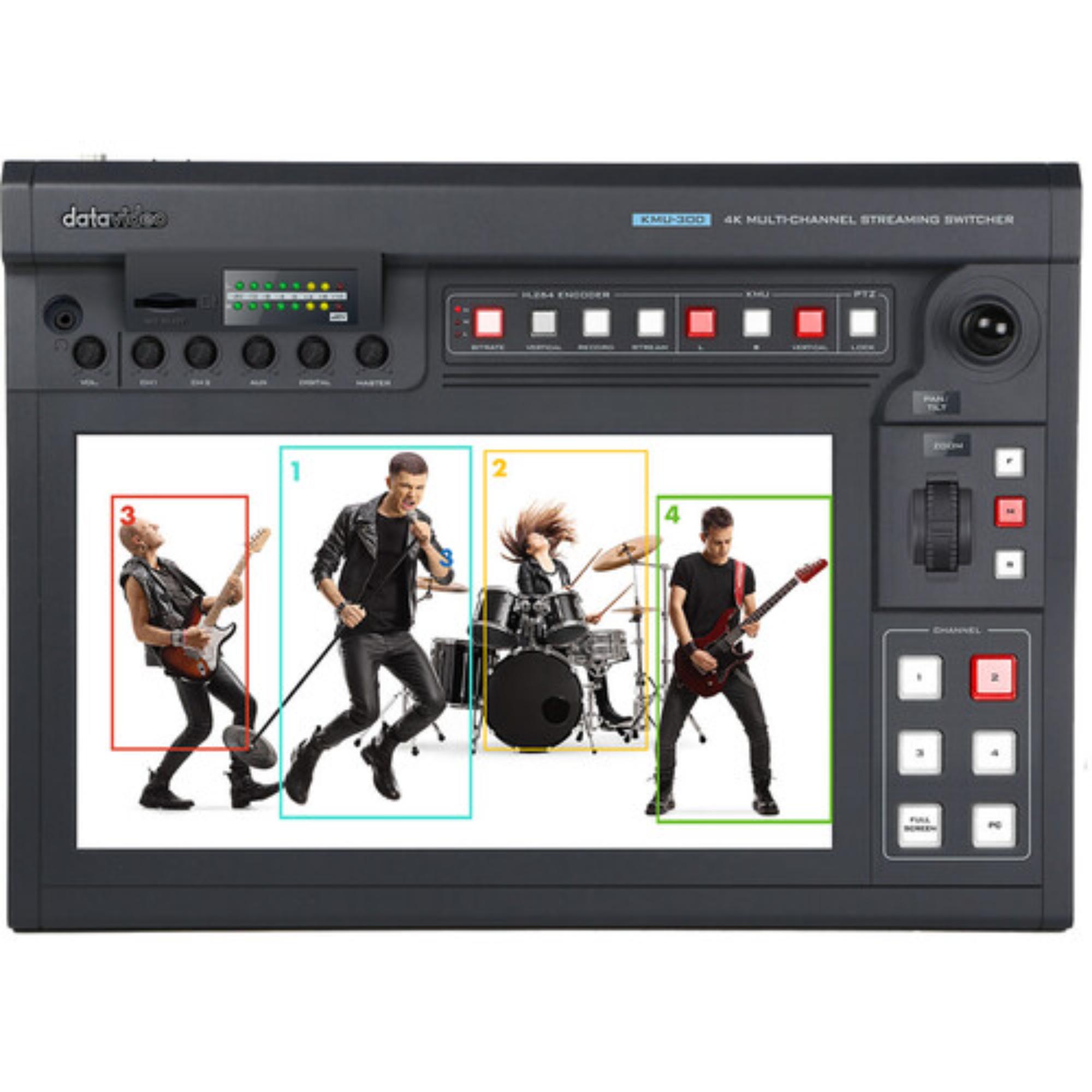 DATAVIDEO 4K Multi-Camera Processing Switcher with Built-In PTZ Camera Control is built for productions that need switching, streaming, recording, and camera control to happen in one place instead of across multiple separate boxes. Based on the source details, this is the KMU-300, a portable multi-camera touchscreen switcher designed around a 14 inch capacitive touch display, UHD 4K input support, built-in H.264 streaming, SD card recording, and integrated PTZ camera control.