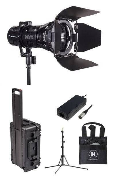 The WASP 100-C LED Spot Light Travel Kit from Hive Lighting features a lightweight travel Stand, a hard rolling case with padded dividers, Wasp 100-C LED Head with 22° reflector, Medium, Wide, and Super-Wide lenses and 5" Four-Barn Doors.