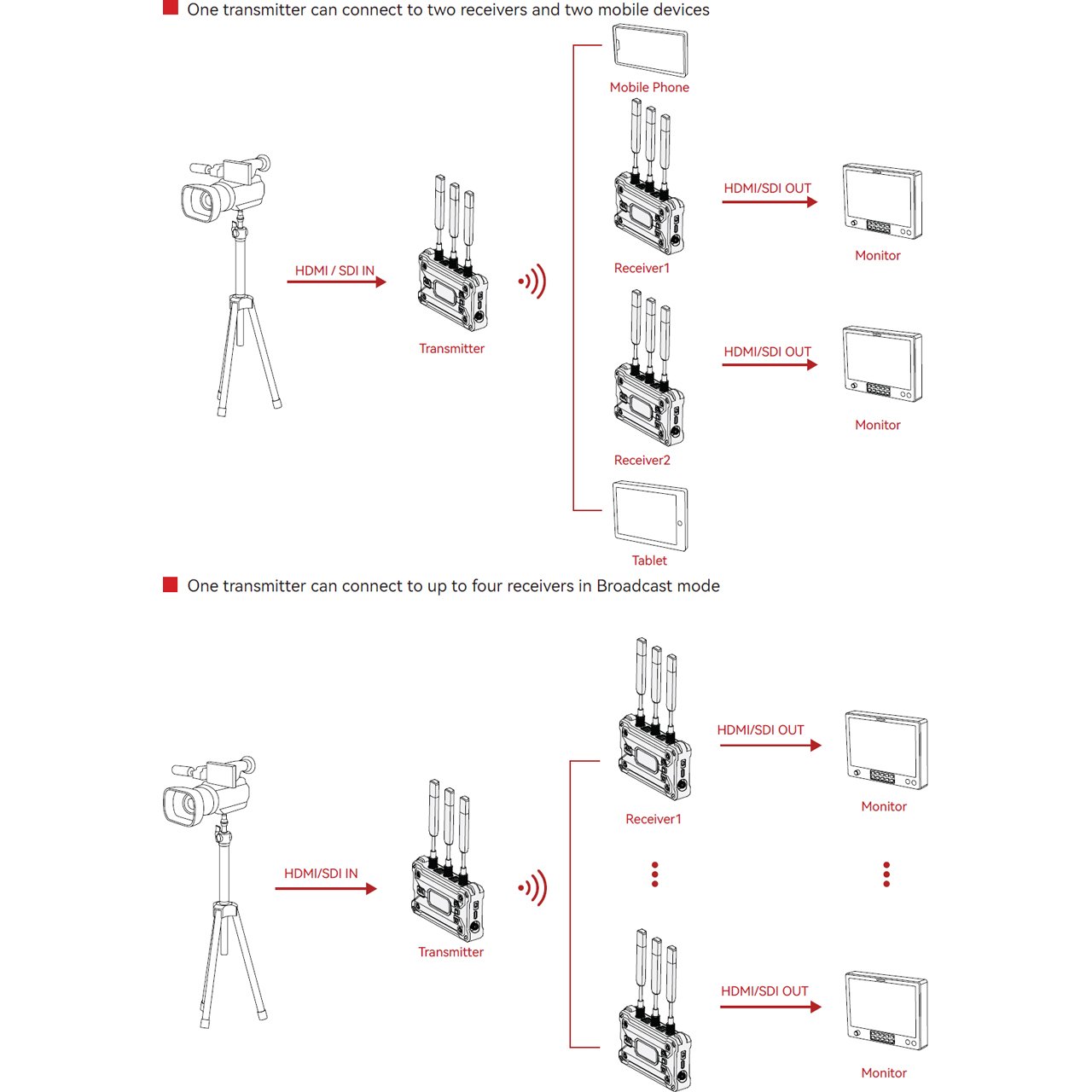 In Broadcast Mode, the system supports up to four receivers and two mobile devices, with a range of up to 650 feet. The receiver features both HDMI and SDI outputs for maximum flexibility.
