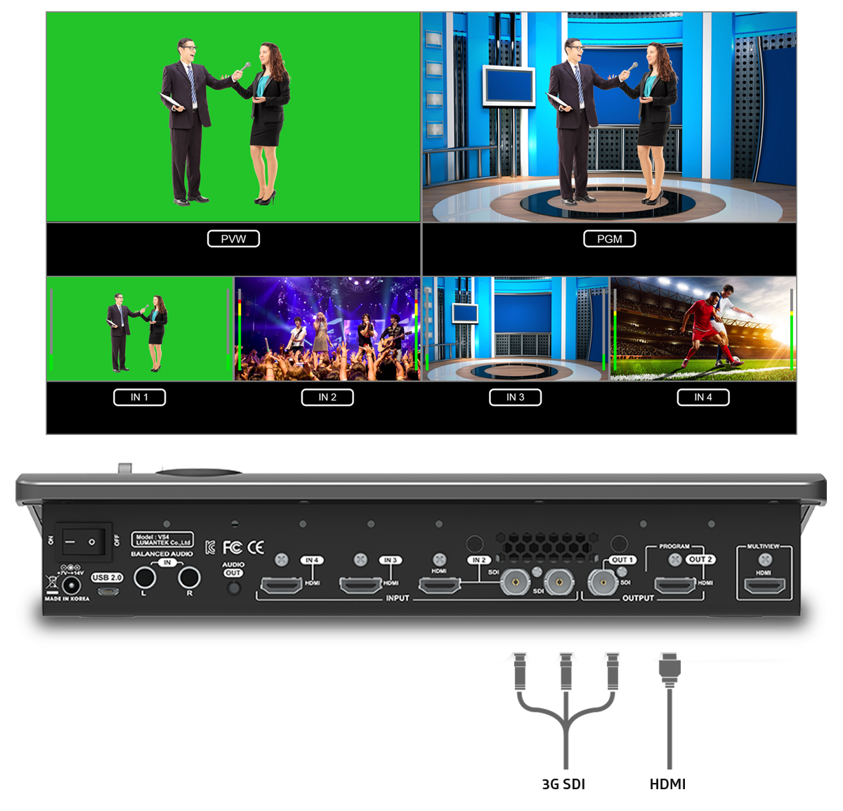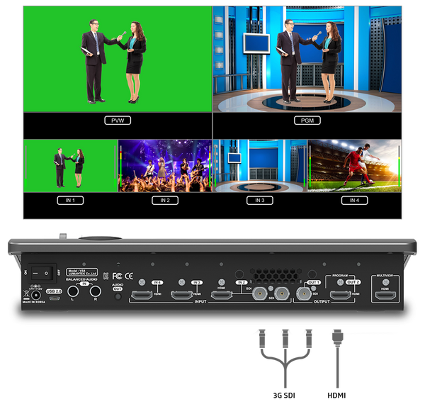 The Lumantek EZ-Pro VS4 4x1 Multiview Switcher is a 4 channels video source switcher. The video can enter through HDMI and/or SDI ports and can be assigned to HD displays and projectors. You can monitor videos through 1 x HDMI Multiview, and display Program output through either 1 x HDMI and/or 1 x SDI. The EZ-Pro VS4 also receives TS type 6.35mm (1/4") Balanced External Audio ports, and sends out audio through 3.5mm Stereo port. The EZ-Pro VS4 is ideal for church worship, educational activities, weddings, ceremonies, theater, and live concerts.