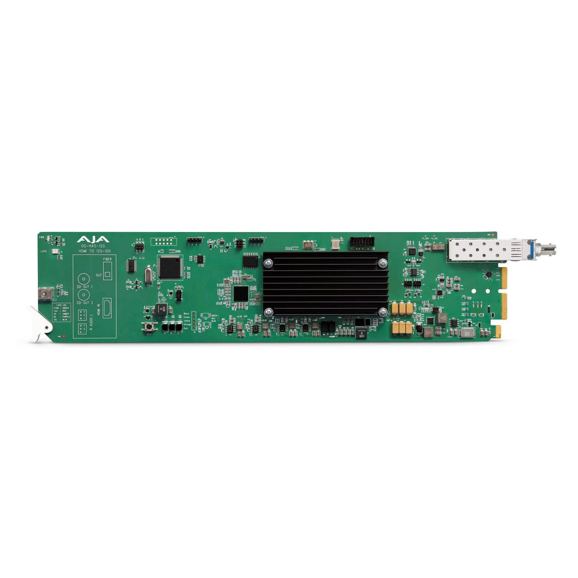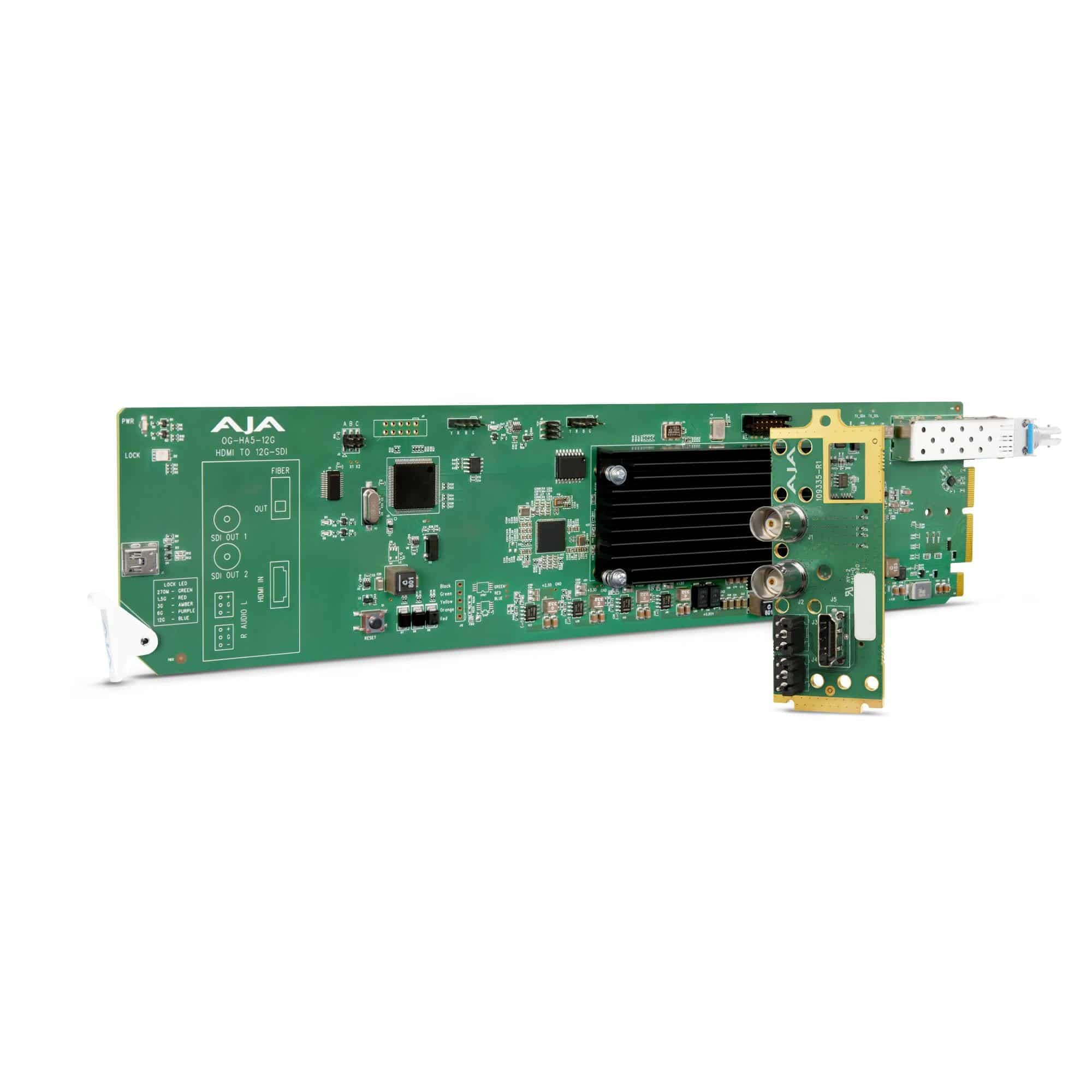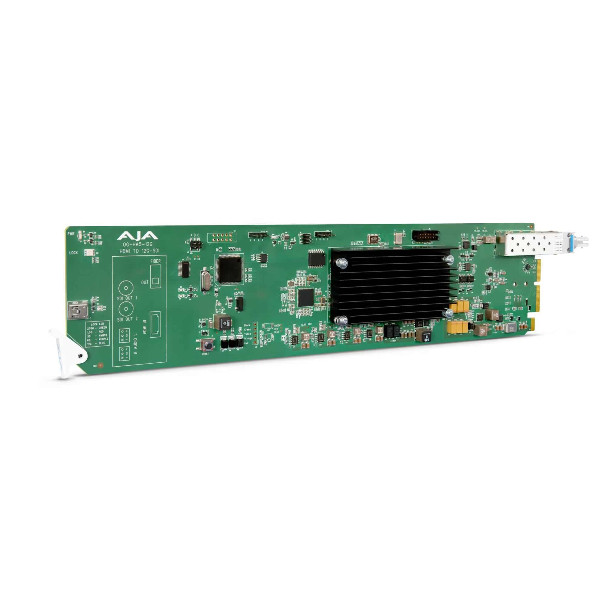 AJA OG-HA5-12G-T-ST is an openGear-mounted converter card designed to take HDMI 2.0 sources and put them cleanly onto a 12G-SDI signal path. It supports formats from SD through 4K/UHD up to 60p and is built for rack-based environments where HDMI sources need to integrate into SDI and fiber workflows.