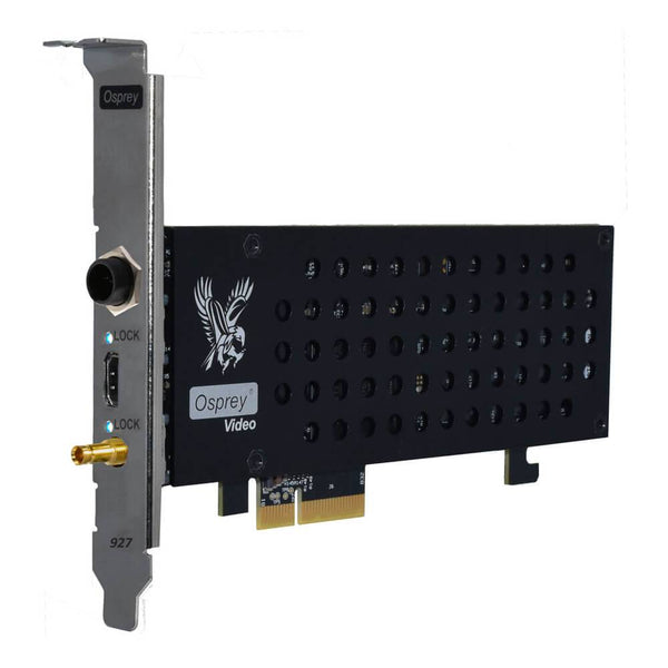 The Osprey Raptor Series 927 PCle Capture features one HDMI connection rated at 4K30 (HDMI 1.4) plus one SDI connection rated at 3G. The HDMI Input supports 8 embedded Audio Channels (4 Stereo), the SDI input 16 embedded Audio Channels (8 Stereo). In addition to embedded Audio, Osprey 927 also supports a pair each of Balanced and Un-Balanced Analog Stereo Audio.
