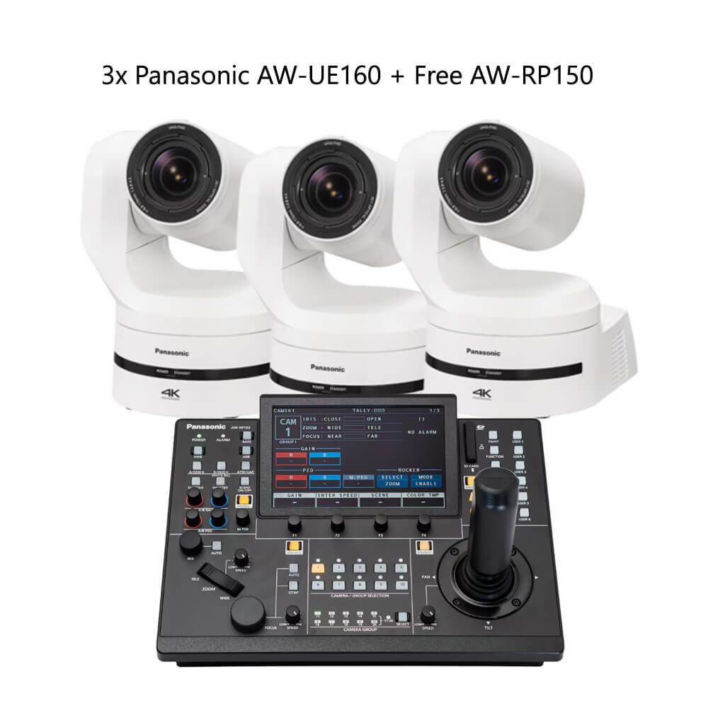 Step up your live production quality with the Panasonic AW-UE160 PTZ Camera 3-Pack (White). This powerful bundle delivers broadcast-level performance and unbeatable value, featuring three advanced 4K PTZ cameras and a complimentary AW-RP150 controller (a $5,500 value). Ideal for churches, studios, sports, and live concert events, it gives you the tools to produce professional multi-camera content with cinematic precision and flexibility.