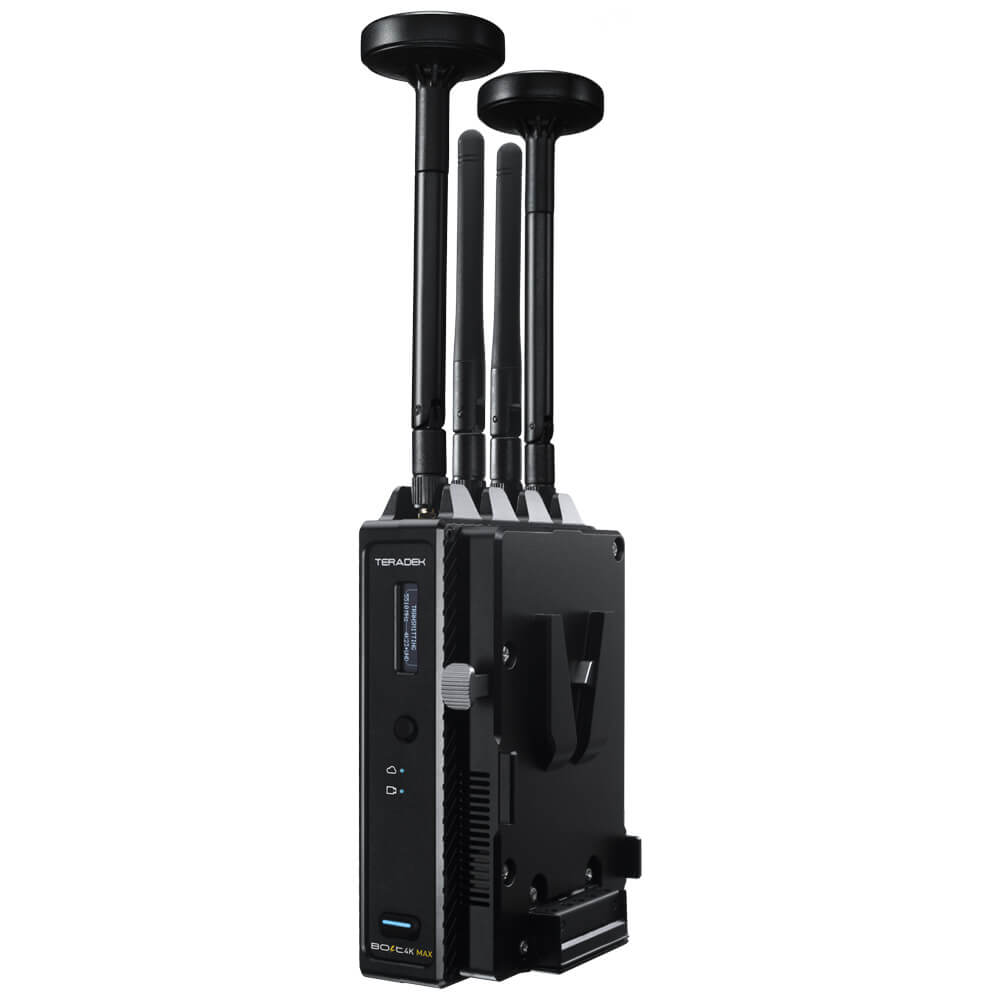 The Teradek Bolt 4K MAX 12G-SDI/HDMI Wireless Transmitter (V-Mount) is a real-time wireless video transmitter that supports up to 4K 60FPS video signals up to 3,000 ft line of sight. The 4K MAX features increased range, faster re-connection times, easier setup with Bluetooth App for iOS or Android, and more stable connectivity. These devices are cross-compatible with the entire Bolt 4K Family. Featuring a Gold Mount Battery Plate for mounting directly to the back of your camera or monitor. The Bolt 4K MAX is the most reliable, highest-performance wireless video system we’ve ever created. Featuring exclusive technology found only in this model, the MAX is designed to be your mission-critical wireless workhorse.