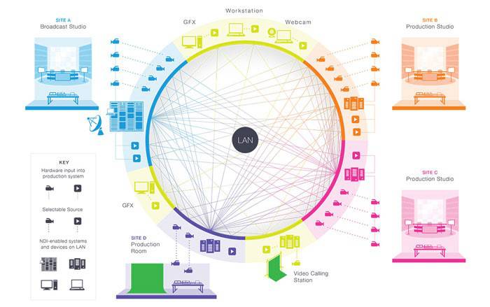 NewTek’s Advanced IP Workflow utilizes the Network Device Interface (NDI) protocol to make every enabled device, connected source, and video signal on your network—production switcher, replay system, computer, graphics machine, video calling system, etc.—visible and available as a source and/or destination for video over IP. NDI is also openly available as an SDK to any customer, manufacturer, or developer who wants to implement it into their products and workflows to accelerate their transition to IP.