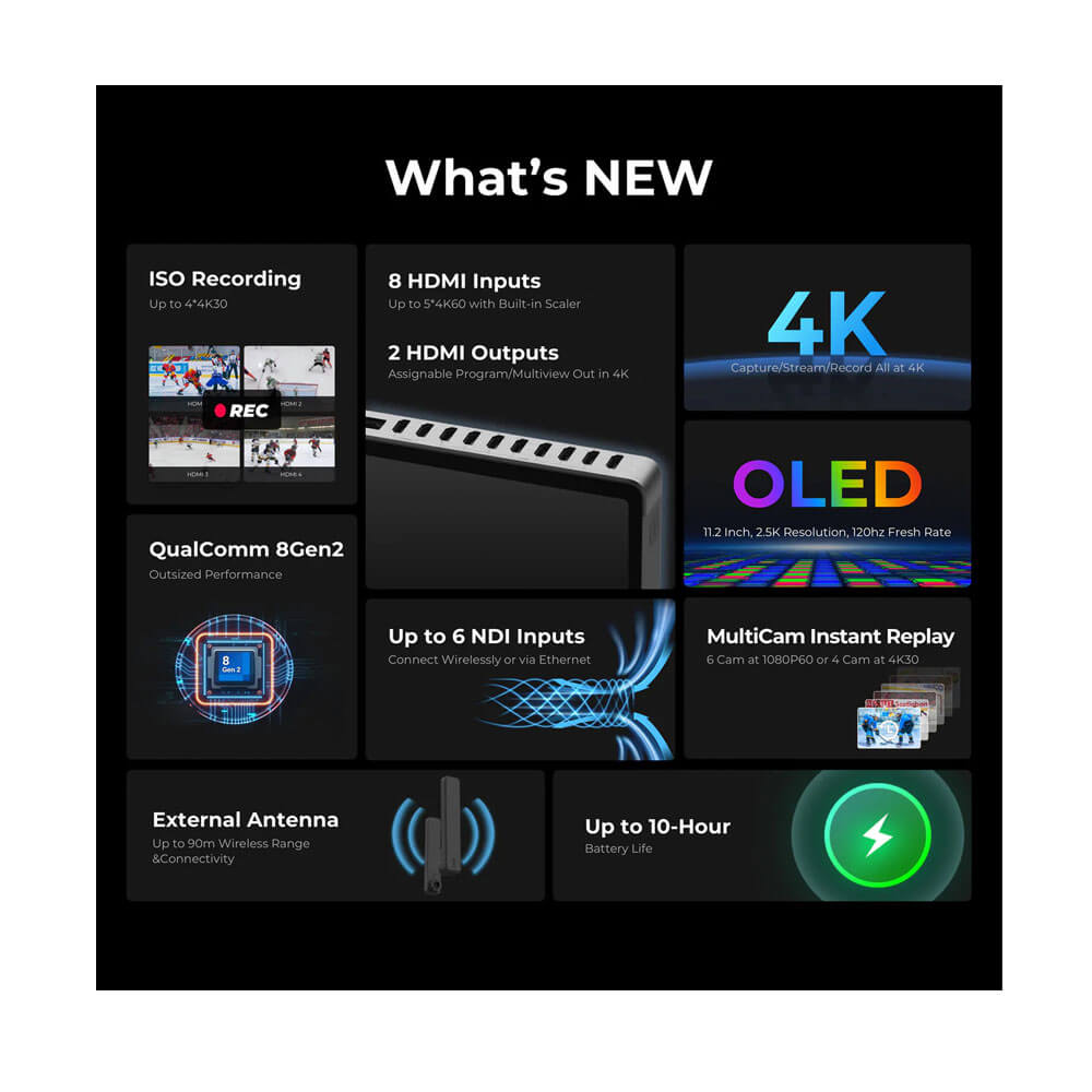 You can stream UHD 4K video over Wi-Fi 7, wired Ethernet, or 4G LTE using a Nano SIM, giving you reliable options whether you’re in a studio or on location. With eight HDMI inputs, six NDI sources, USB-C, and USB-A connectivity, the YoloBox Extreme handles multi-camera setups with ease. Its 11.2-inch OLED touchscreen stays clear even outdoors, thanks to a bright 1000 cd/m² display. The built-in 10,000mAh battery keeps you live for up to 10 hours without needing external power.